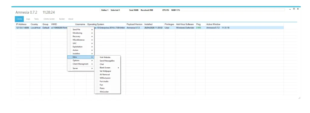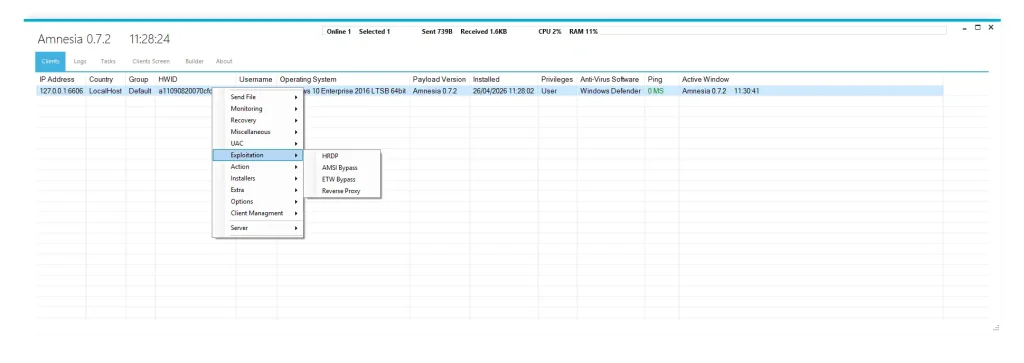 Unlike traditional malware, Amnesia 0.7.2 operates like a full cyber operations toolkit. It enables attackers to remotely control infected machines, steal sensitive information, bypass security systems, and maintain long-term access without detection.