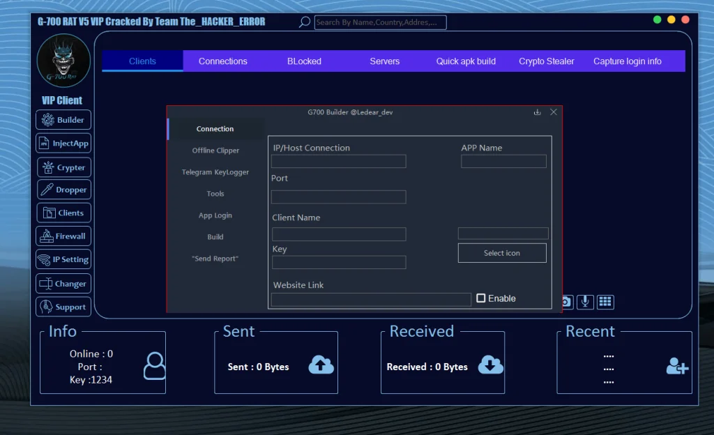 Based on interface analysis and security research patterns, G 700 RAT appears to include a modular control structure, separating features into logical sections such as connections, monitoring, data access, and persistence mechanisms.